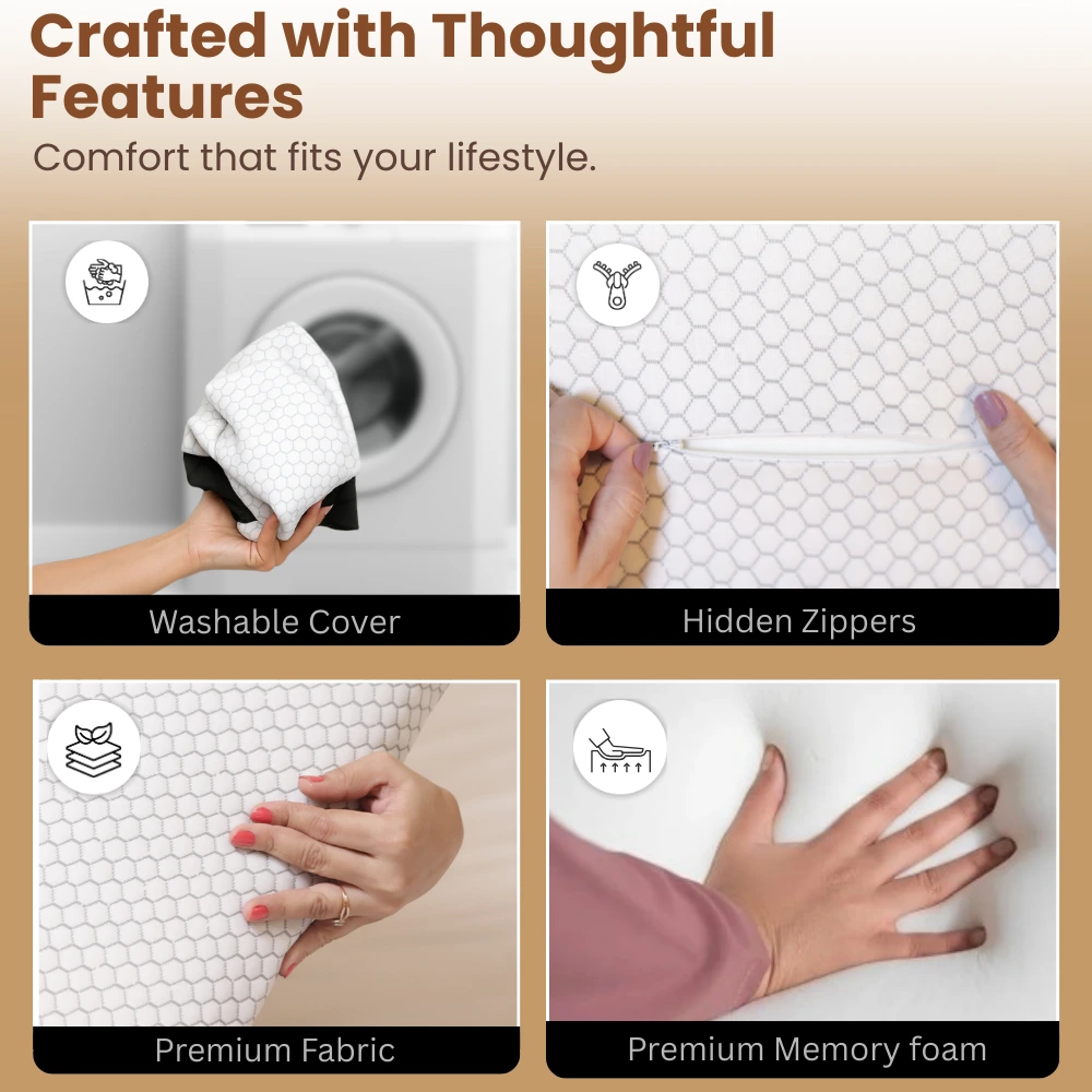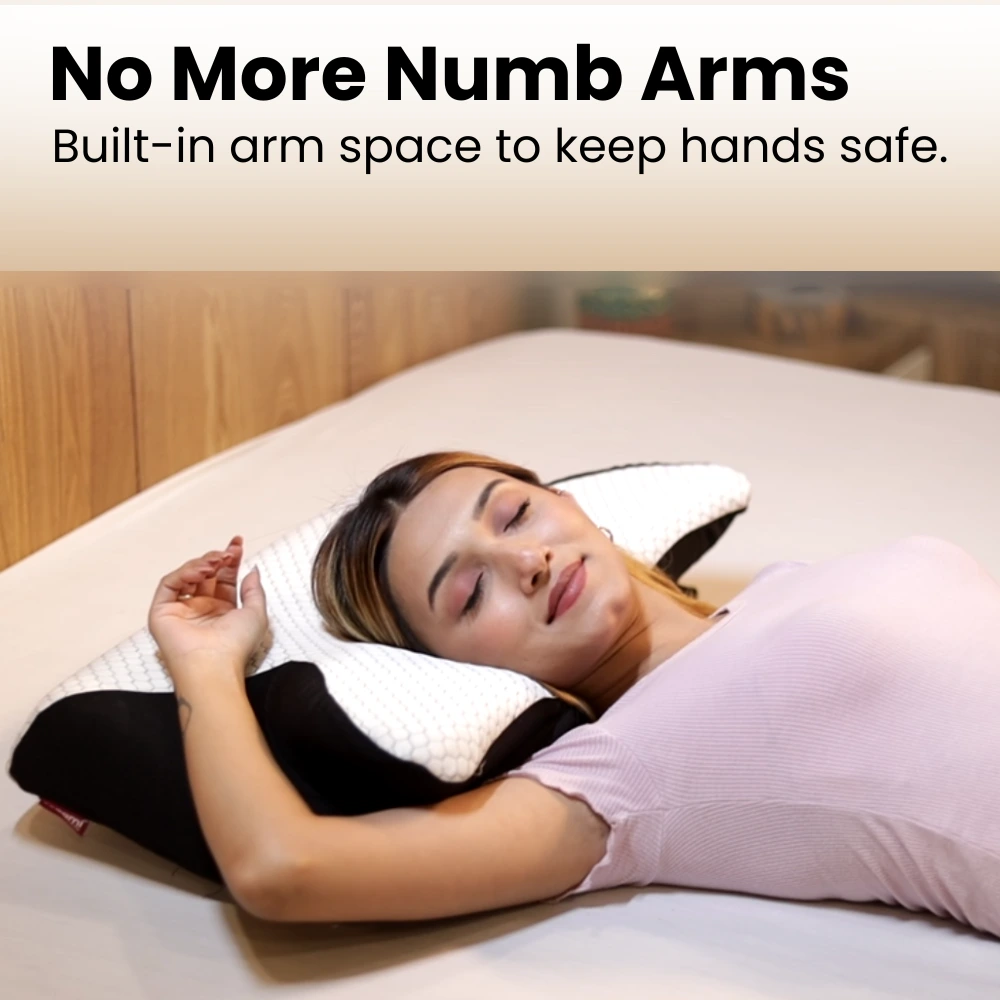 With built-in arm rests, this pillow supports side sleeping by cushioning your arms and relieving pressure—helping you wake up without numbness or discomfort.