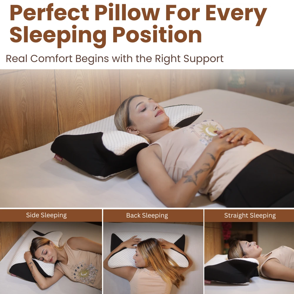 Where traditional pillows fall flat, the Araami butterfly pillow supports your neck at two different heights, relieving pressure and adapting to your sleep style.